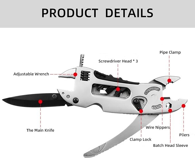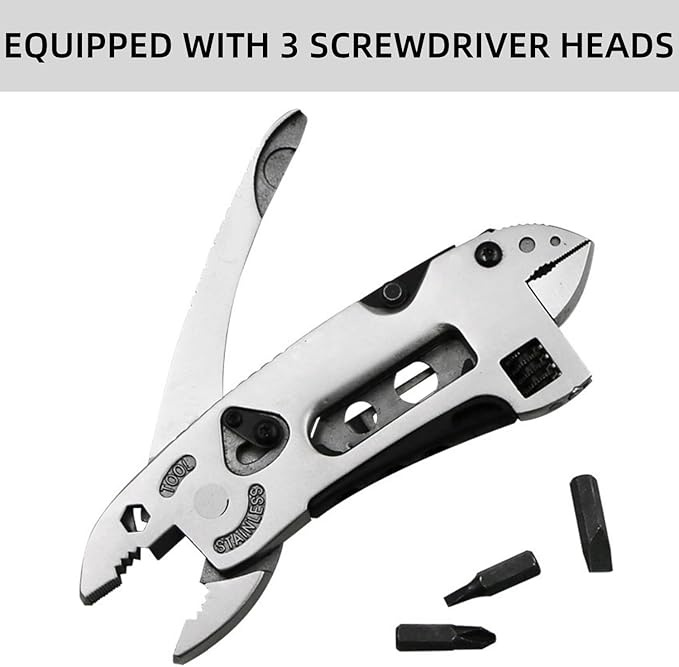 Stainless Steel6 in 1 Specialty Tools: Multitool with 7 tools, wire cutter, screwdriver, wrench, pipe clamps, sleeve holes, knife, lightweight design, and removable pocket clip, wrench multi-tool is always within reach and ready to work. The first choice for each family DIY toolboxStainless Steel Material: The multi tool plier is made of high-quality stainless steel material, heat treated to make it ultra tough. With certain hardness and strength, not easy to be damaged and deformed, sturdy and durable, and has a long service lifeMultifunctional Pocket Tools: Multitool plier is your go-to tool for projects at home, at work, or at the campsite, almost any job can be done when you have this multitool in your pocket, it is best for camping, fishing, hiking, cooking, hunting, picnic, home, road trip, diy, any outdoor activities and moreComfortable Ergonomic Grip: Humanized elliptical arc design for a comfortable and non-slip grip. Suitable for both right-handed and left-handed users. Offers a pleasant feel in your hands during useSafe and Portable: The pliers have a lock design to prevent accidental closing of the blade, avoid hand injury during operation, and can be used with peace of mind. Multi-tool design with Pocket Clip, You can use the belt clip to attach it to your belt or clip this on a difference belt, key ring and backpack. It easy to keep all in one multi tool pocket tool in your pocket. And this is a best father's gift