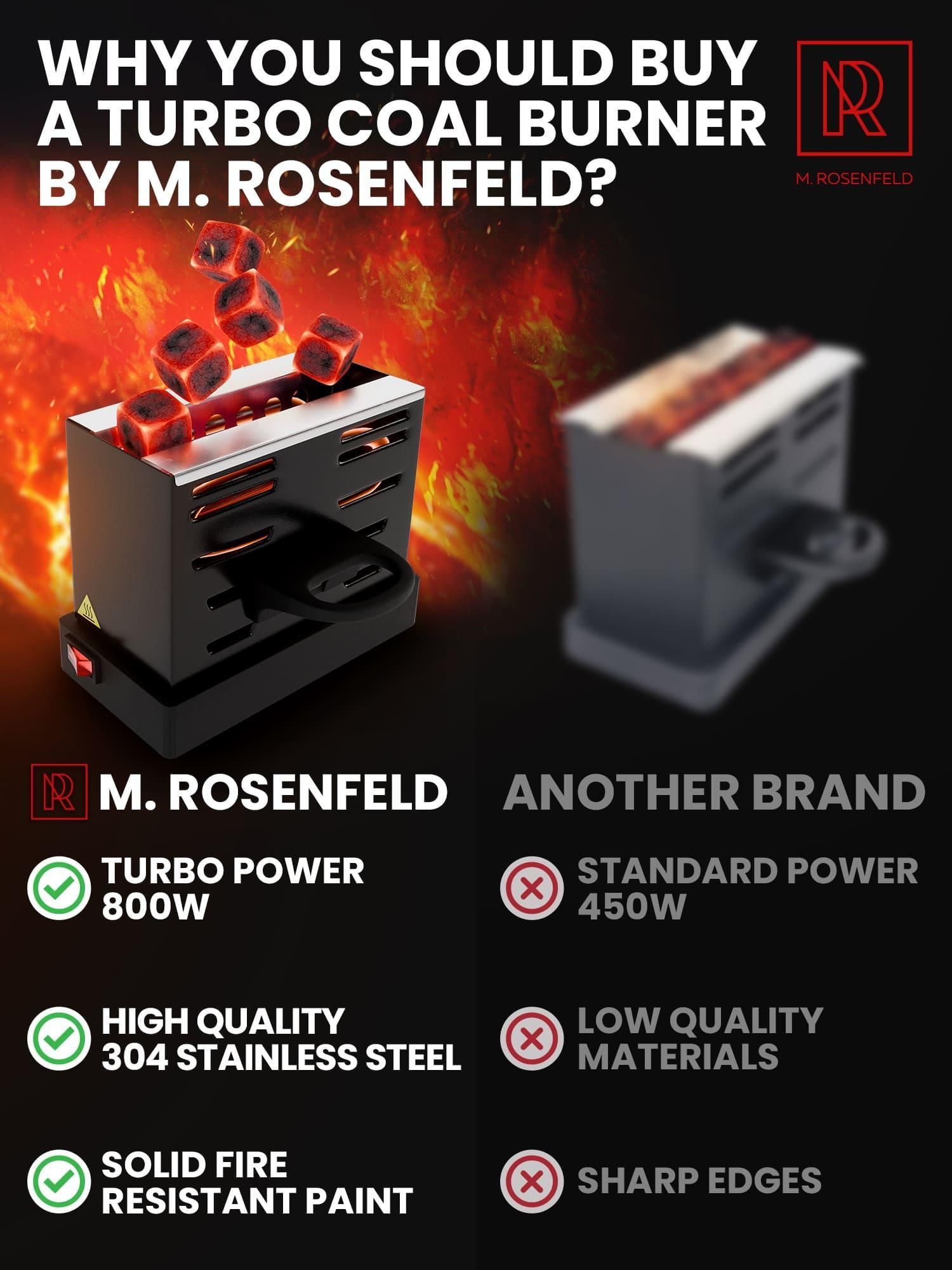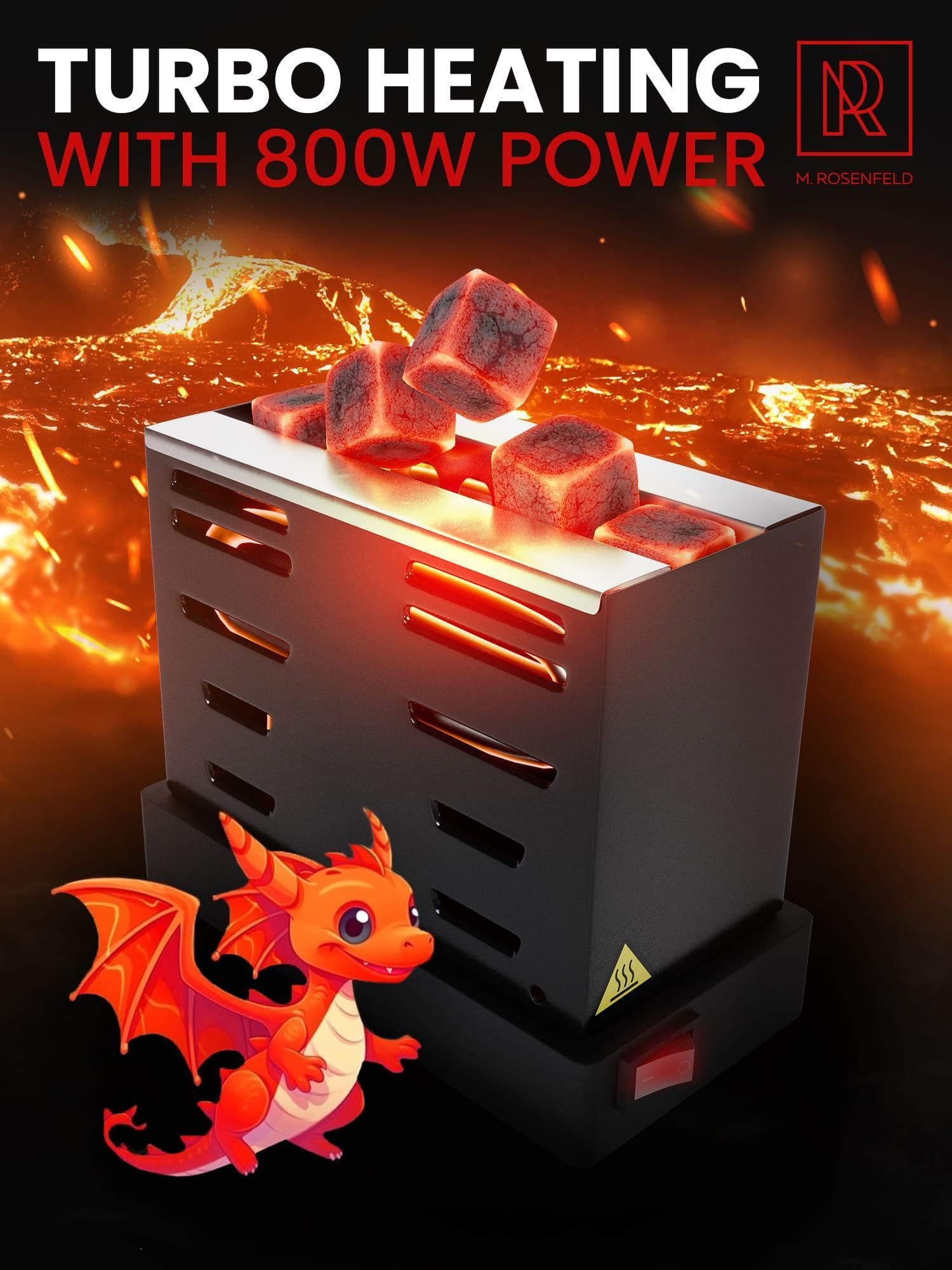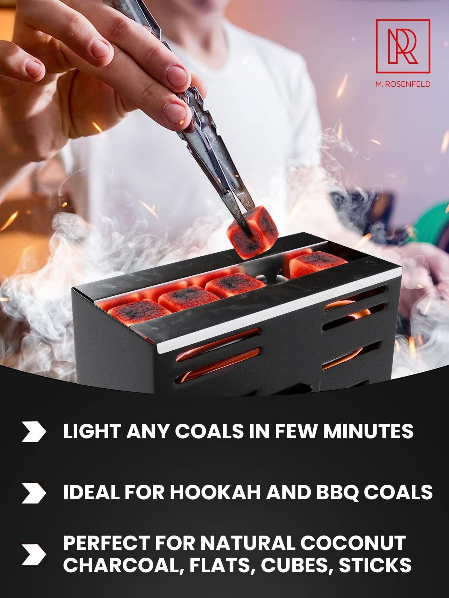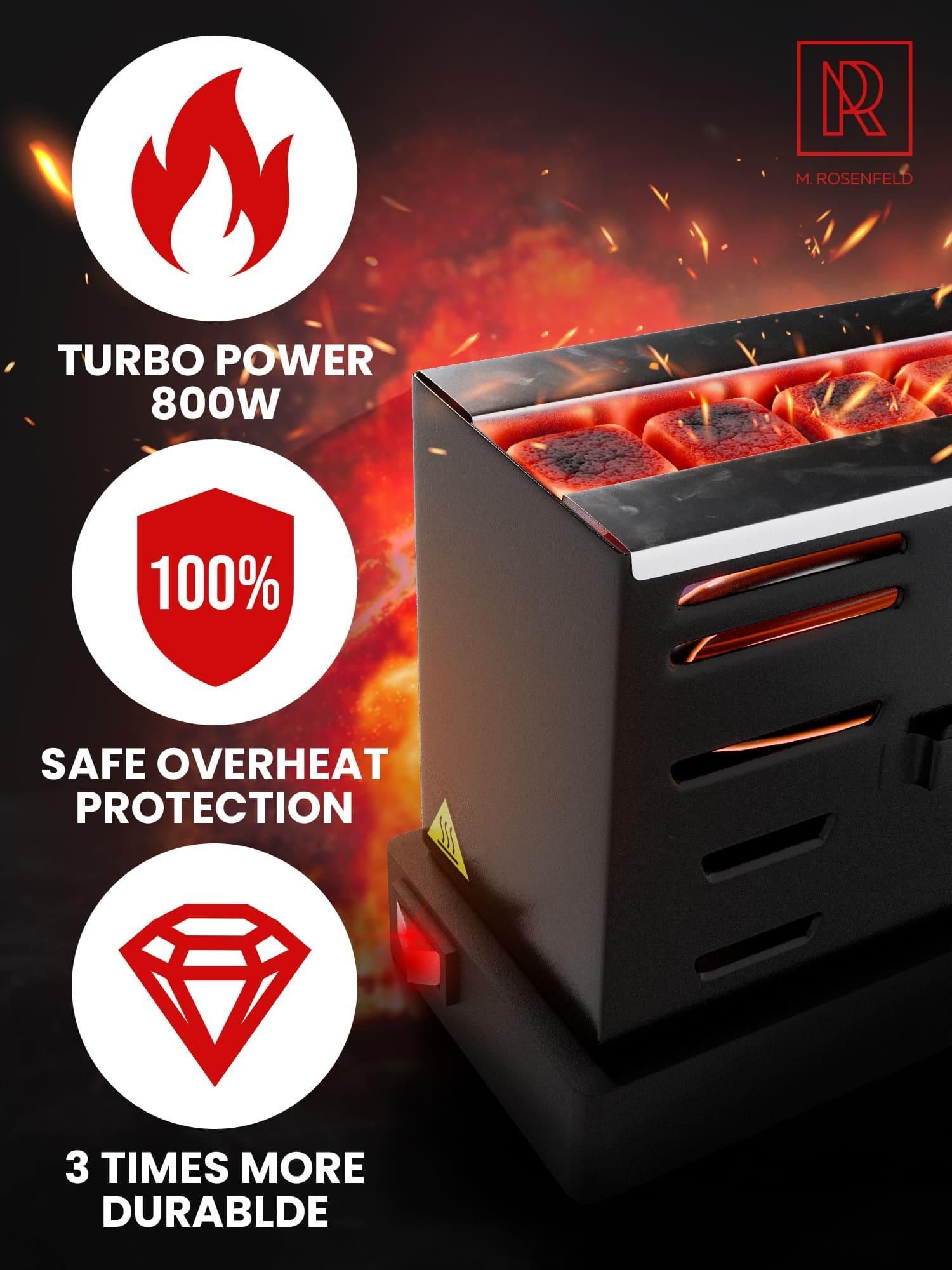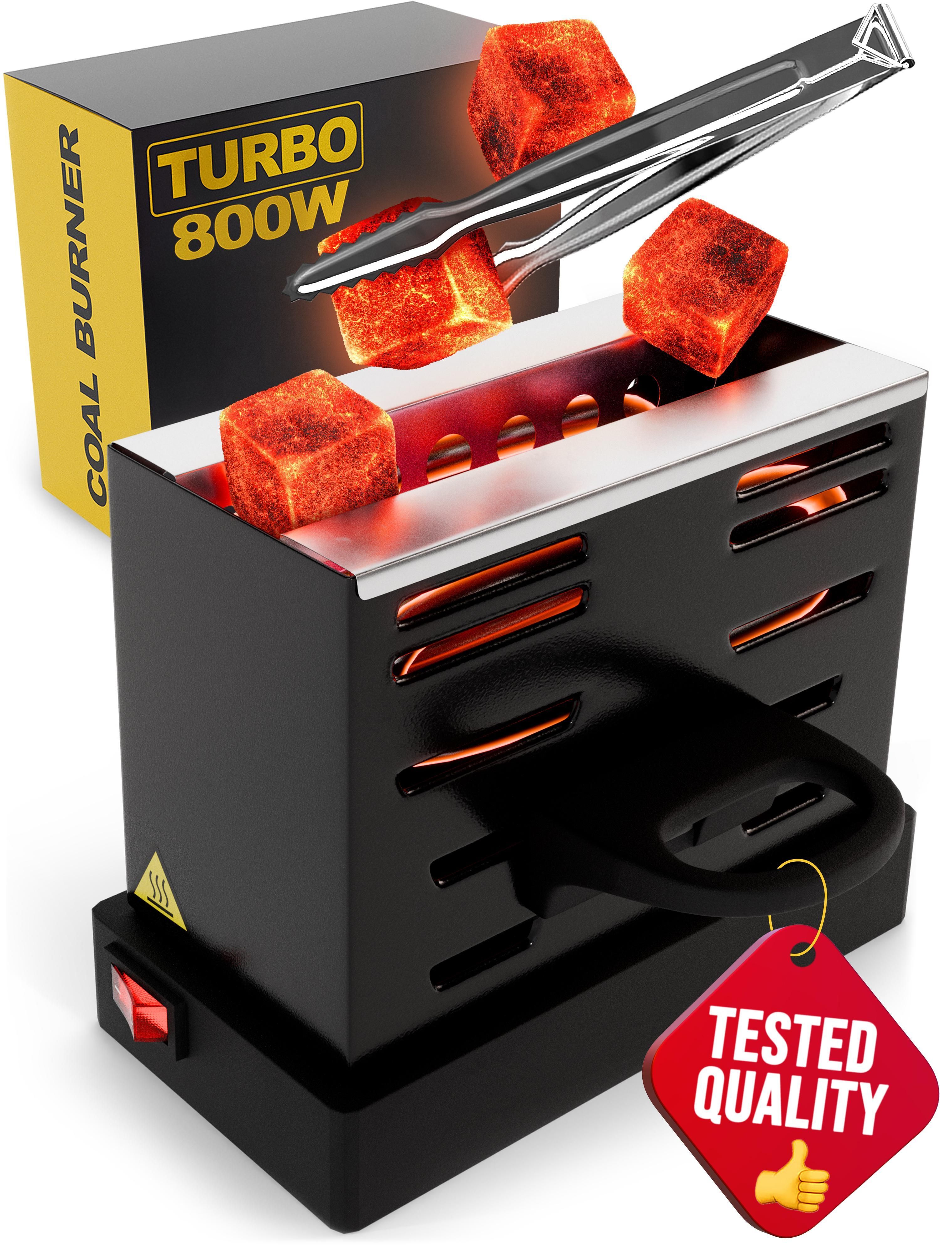 1.turbo heat & universal - with a super powerful 800-watt output, this hookah starter electric grill heats coals for hookah (coconut charcoal, bamboo, wood) to burn red in just 6 minutes, making them ready to use. suitable for any kind of hookah coal: cubes and flats! full hookah accessories set - includes hot plate, 800w premium coal toaster multipurpose electric stove and free extra hookah shisha tongs for tobacco and for shifting coals. easy to use & safe - plug in & turn on